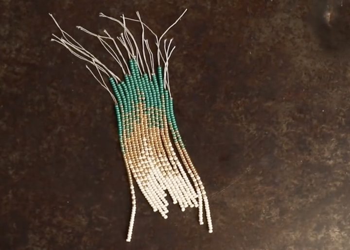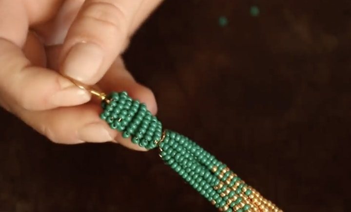 Отрежьте нить, наберите одну бусину бисера, расположите ее посередине, подвяжите. Вставьте обе нити в иглу и завяжите кончик. Продолжайте набирать бисер.