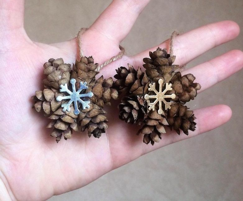 Шишки — отличный материал для создания снежинок. При желании их можно покрасить в любой цвет или оставить такими, какими их создала природа.