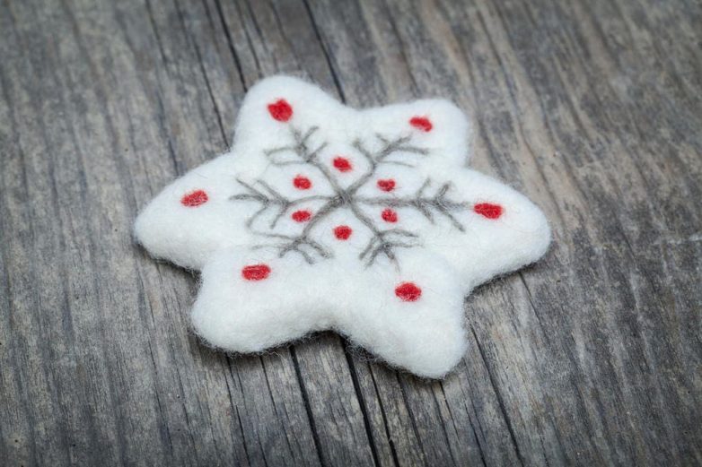 Мягкая, белая и пушистая снежинка, дополненная имитацией вышивки, выполнена в технике валяния.