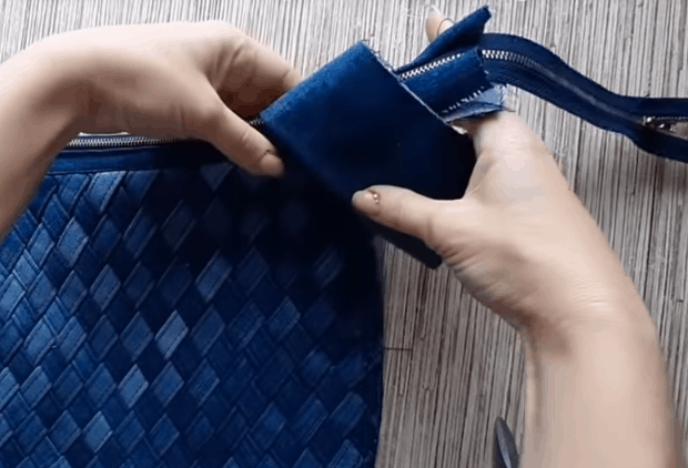 Если нужен внутренний карман, пришейте его к заготовке подкладки. Из джинсовой ткани вырежьте две широкие ленты и пришейте их к створкам молнии.