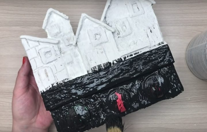 Сделайте три детали для будущего домика, склейте их вместе. Приклейте к основанию.