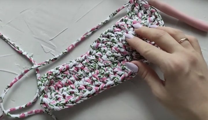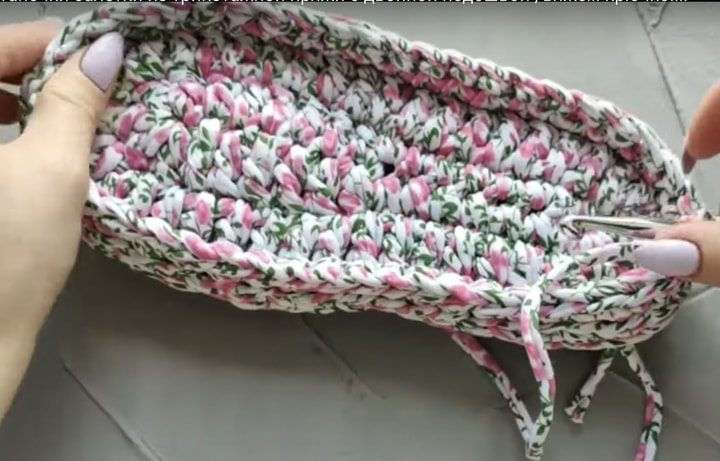 В соединительный столбик, расположенный посередине пятки, вставьте крючок и закрепите нитку. Провяжите первый ряд столбиками без накида. Конец закройте соединительным столбиком.