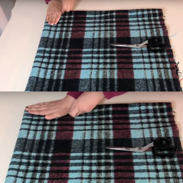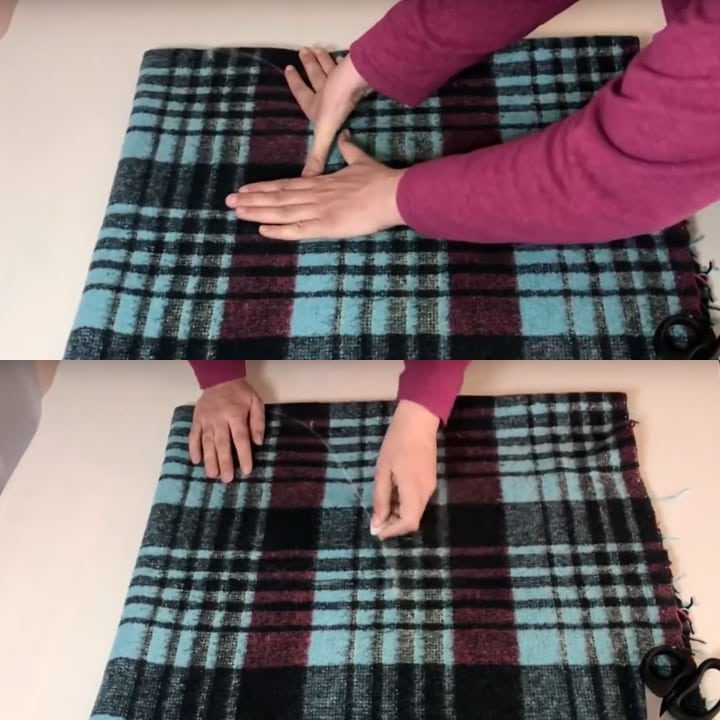 Сложите плед дважды, чтобы получилось четыре слоя ткани. Со стороны с закрытыми складками отметьте от края расстояние размером со свою ладонь.