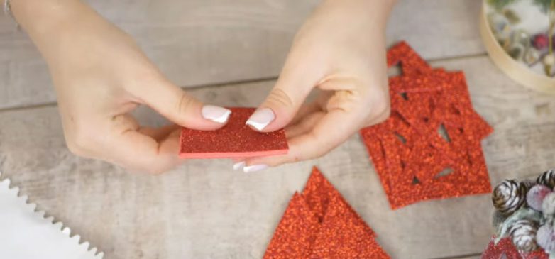 Следом приклеиваем четыре детали для крыши, внутрь вклеиваем нитку, за которую и будем вешать игрушку на ёлку.
