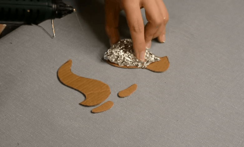 Для формирования хвостика и корпуса потребуется по две заготовки, а для лапок по одной, так как в месте стыковки лапок с туловищем дополнительный объем не нужен. Приклеиваем фольгу к картону, чтобы получить объемные детали вместо плоских.