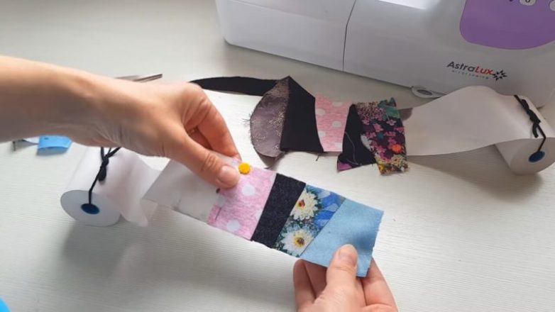 Снимаем булавки, разглаживаем лоскутки, чтобы работа была аккуратная. Таким же образом прикрепляем третий кусочек ткани, но уже ко второму лоскутку, прострачиваем на машинке. Продолжаем работу до тех пор, пока не получим полосу нужной длины.