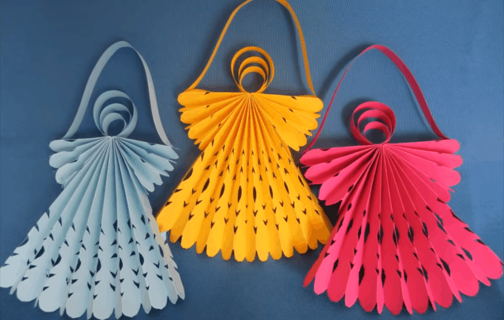 Все, что потребуется — несколько листов обычной бумаги и немного клея для дополнительной фиксации некоторых деталей. Такие ангелки могут стать украшением для елки или основой для гирлянды.