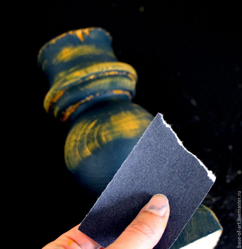 Теперь самое время взять в руки шкурку. В данном случае рекомендуем взять шкурку с самым мелким абразивом или вообще посудную губку, и начинаем стирать краску на выступающих частях подсвечника. Наблюдайте!