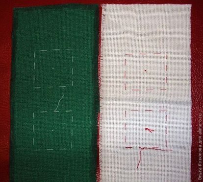 Вырезаем полоски нужного размера, не забывая оставить припуски на швы около 1,5 см с обоих сторон. Края канвы я промазала клеем ПВА, чтобы не осыпались. Отмечаем место будущей вышивки.