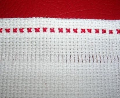 Чуть ниже края выдергиваем нити из канвы, чтобы продеть ленточку.