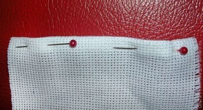 Подворачиваем дважды верхний край, закалываем булавкой. Нужно следить, чтобы край четко совпадал с линиями канвы.