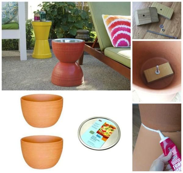 Натуральные материалы — не единственное достоинство этой скамьи. Округлые линии места для сидения обеспечат комфорт, не сравнимый со стандартными вариантами. Если скамья все же покажется вам жесткой, возьмите несколько декоративных подушек или небольшой матрац. И не забудьте покрыть фанеру и деревянные планки водоотталкивающими пропитками.Столик из цветочных кашпо
