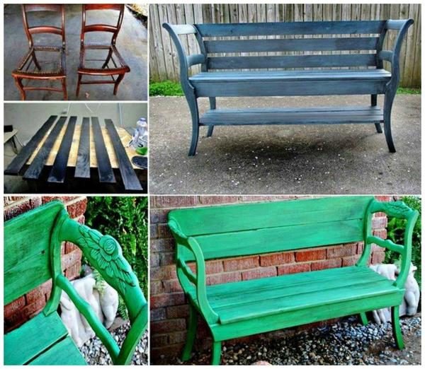 Два старых стула могут обрести новую жизнь в необычном облике. Для этого их ставят друг напротив друга и «обшивают» досками. Чем красивее спинки стульев, тем оригинальнее будут ручки скамьи.
