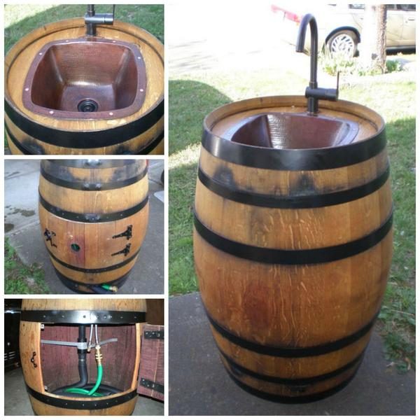 Старая винная бочка подойдет тем, кто любит винтаж и мечтает о чем-то оригинальном. Для такой тумбы не принципиально, есть ли «пробоины» в деревянной части. Она играет декоративную роль. Внутреннее пространство отдано под функциональные вещи — подводку и отвод воды, шланги, сифон, краны. Все это тщательно прикрыто дверцей из вырезанных досок той же бочки.