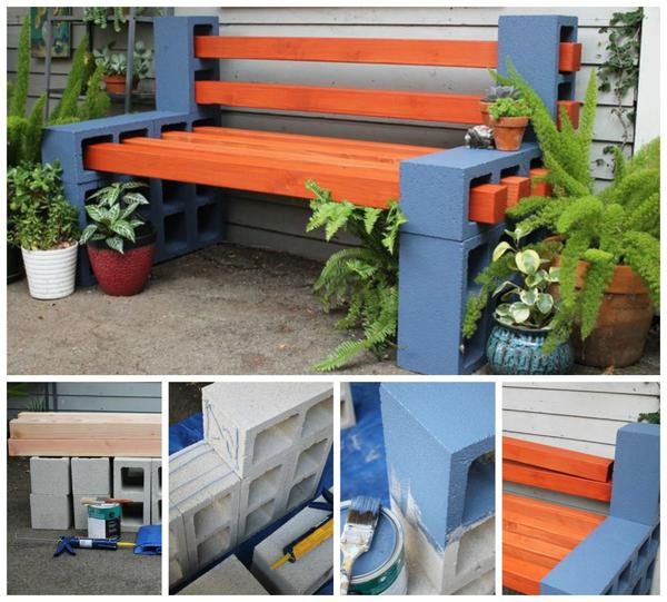 Если вы не хотите тратить много денег на скамью, сделайте ее из простых строительных материалов — бетонных шлакоблоков и деревянных реек. Блоки уложите в Г-образные боковинки, «склеив» их между собой жидкими гвоздями. Потом «проденьте» рейки в отверстия блоков, как нитку в иголку. Добавьте подушки и наслаждайтесь приятным отдыхом на свежем воздухе.