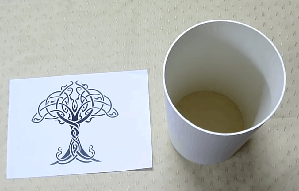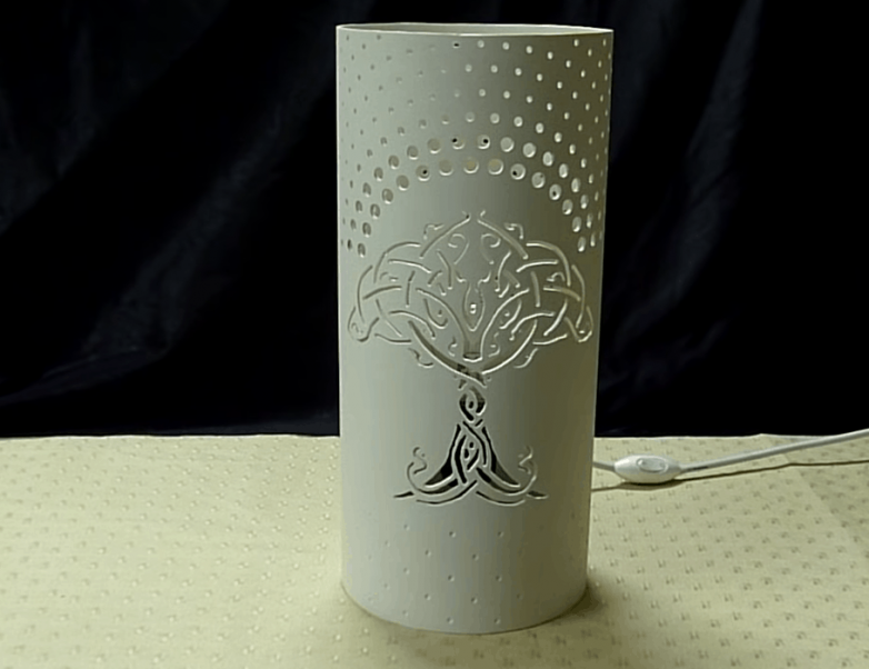 Эффектный и предельно простой светильник легко сделать из обрезка ПВХ трубы большого диаметра. Ничего лишнего, только изящный светящийся цилиндр с замысловатым узором, классическая форма и нарочитая простота которого безупречно вписываются в обстановку.