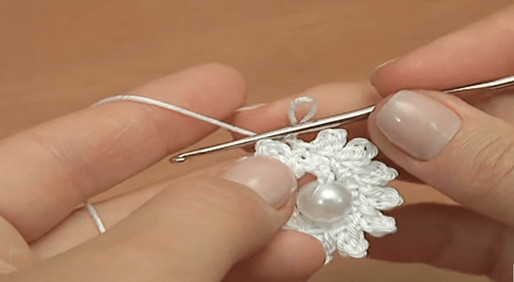 Для того, чтобы начать второй цветок, выполняем одну воздушную петлю и на крючок одеваем бусинку, протягиваем петлю через отверстие бусины.
