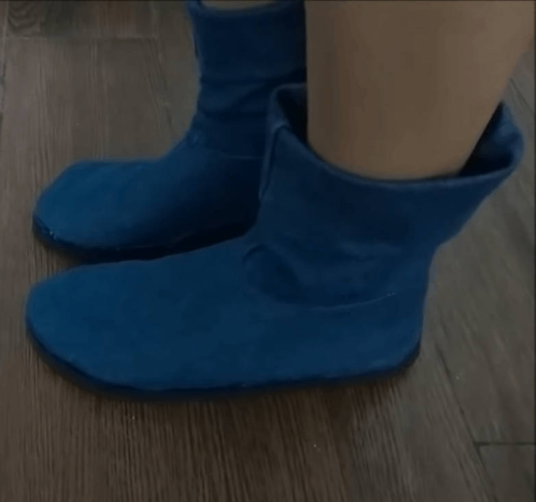 Дальше остается лишь вывернуть сапожки, приклеить их к резиновой подошве от шлепанцев и дать хорошо высохнуть. Такие сапожки станут отличной альтернативой комнатных тапочек. При необходимости всегда можно дополнить их стельками и даже чехлом.