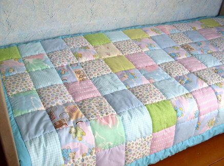 Для того чтобы сделать стеганое одеяло, нужно сшить разноцветные куски ткани и проложить между ними кусочки ваты. Если выбрать яркие лоскутки, то в целом может получиться очень стильное покрывало, которое украсит любую комнату.