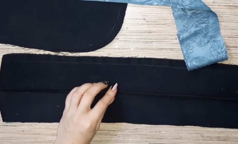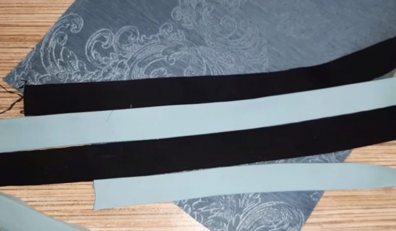Вырежьте из темного джинса две полосы длиной 45 см и шириной 7 см. Чтобы деталь была более жесткой, наклейте на изнаночную сторону дублерин.
