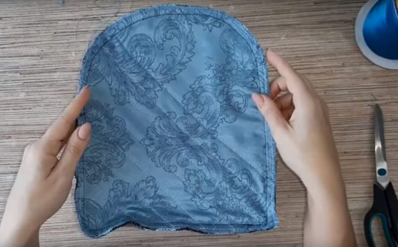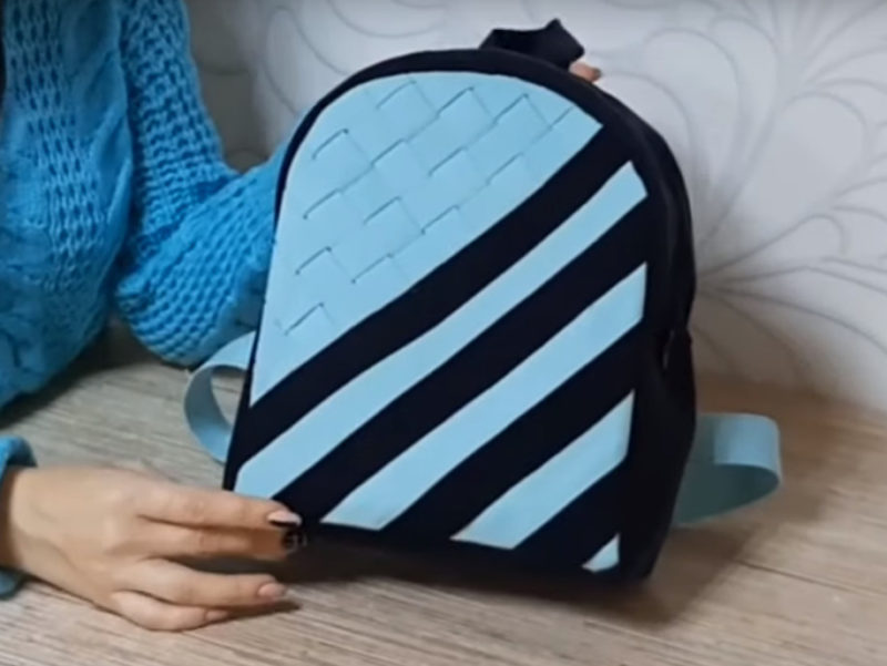 На второй части рюкзака можно сделать красивое плетение из джинсовых лент. Для этого просто продевайте горизонтальные полоски ткани сначала под вертикальными, а затем над вертикальными полосами. Хорошо закрепите полосы на подкладочной ткани.