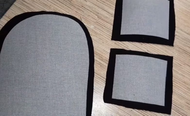 Готовые полоски необходимо прикрепить к передней части рюкзака. Для этого подготовьте основу, в роли которой выступит подкладочная ткань. Вырежьте из подкладочной ткани по трафарету переднюю часть рюкзака, оставляя припуски на швы по 1 см.