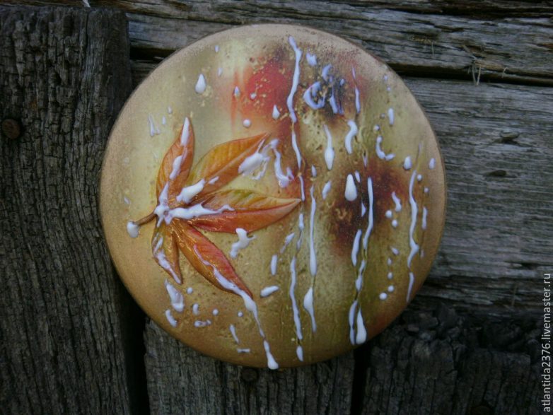 5. Делаем объёмный лист на шкатулке. Помещаем файл на крышку, обводим контур листочка, далее вырезаем обведенный элемент из глины. Подгоняем все размеры (можно было взять картинку без листика, тогда форма и размер листика могли быть любыми), фактурим на молде и, не дожидаясь высыхания глины, приклеиваем лист на шкатулку на клей ПВА.