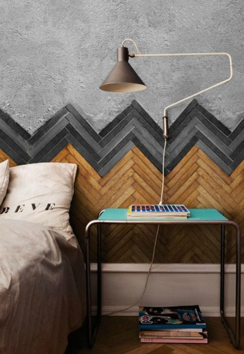 Предварительно зачищенные и покрашенные паркетные доски, оставшиеся от старого напольного покрытия можно использовать для декора одной из стен спальни или гостиной.
