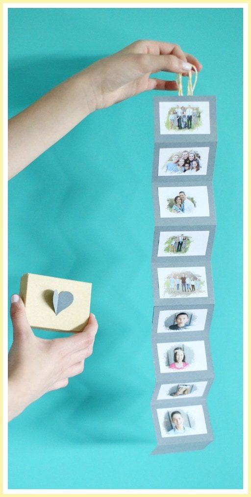 Если у Вас закончились фотографии, просто обрежьте лишнюю часть картона. Следите за тем, чтобы гармошка не получилась слишком толстой и легко поместилась в коробочку.