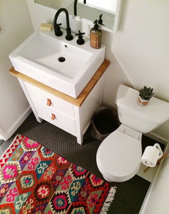 Яркий коврик в интерьере санузла.