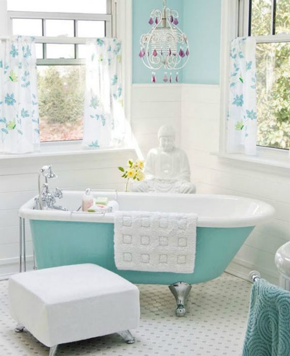 Не многие в состоянии часто делать хотя бы косметический ремонт в ванной комнате. Так, что самый простой способ освежить и обновить интерьер санузла — поменять текстиль. Яркая шторка для ванны, банные полотенца и коврик способны внести свежие нотки и украсить интерьер санузла.