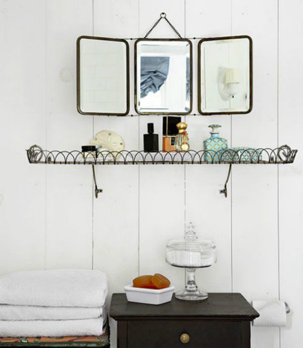 Некоторые вещички из «бабушкиного сундука» можно с пользой использовать для декора ванной комнаты. Например, старинная проволочная полка и тройное зеркало прекрасно впишутся в интерьер светлого санузла.
