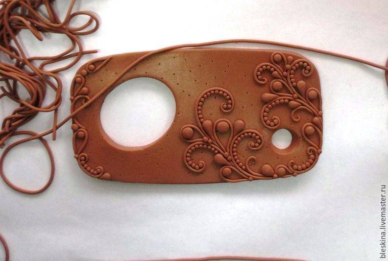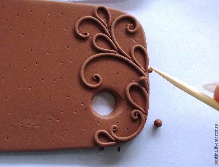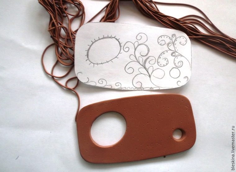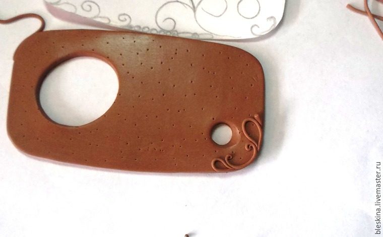 На основе выдавливаем маленькое входное отверстие для палочки с помощью верхней части шариковой ручки. Внешний скос придавливаем наискосок для лучшего вхождения палочки. На противоположном краю заготовки вырезаем выходное отверстие любой формы. Чтобы примерно представлять рисунок, делаем эскиз на шаблоне. На первый раз чем точнее, тем лучше (у меня очень примерный).