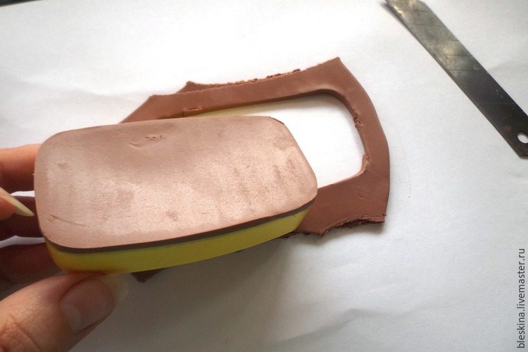 Глину (да простят меня керамисты! Полимерщики поймут!) разминаем до однородного цвета, раскатываем на максимуме паста-машины или роликом толщиной 3-4 мм, обрезаем по формочке