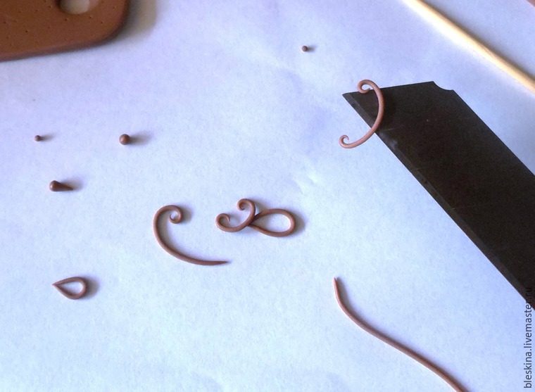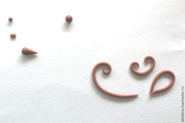 Основные элементы будущего рисунка выполняются из кусочков колбасок. Края раскатываем пальчиком. Потом загибаем с помощью зубочистки и пальца (с ногтями удобнее). Кроме того, понадобятся точки (много точек!), скатанные между пальцами из отрезков 2-3 мм. Жирные капельки — это большие точки, прикатанные с одного края пальцем.