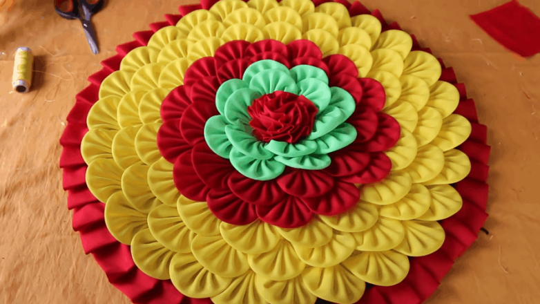 Даже самые маленькие лоскутки легко превратить в оригинальную объемную салфетку или коврик. Навыки плетения при этом не понадобятся, а вот иголкой с нитками запастись придется. В остальном все зависит от фантазии и наличия материала.