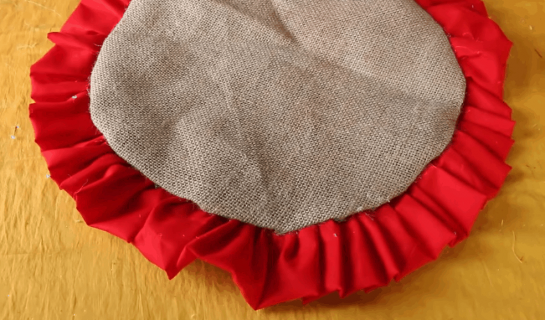 Выбранная техника позволяет обойтись без обработки краев ткани. Они все время будут прятаться внутрь. Согнув пополам ткань для окантовки пришиваем ее к основе, так, чтобы она оказалась между деталями основы. Одновременно закладываем складки.