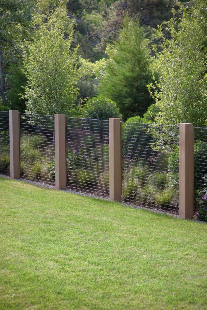 Часть забора здесь заменена рамкой с натянутым тросом. Только представьте насколько интересно будет выглядеть забор, когда зелень оплетет его полностью.