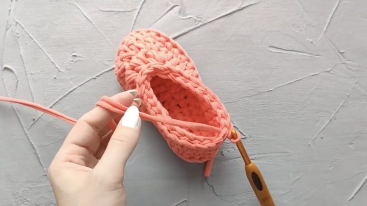 В центр пятки за переднюю стенку заведите нить и сделайте одну воздушную петлю. По кругу провяжите столбики без накида, захватывая кончик нити. В воздушную петлю в конце провяжите соединительный столбик.