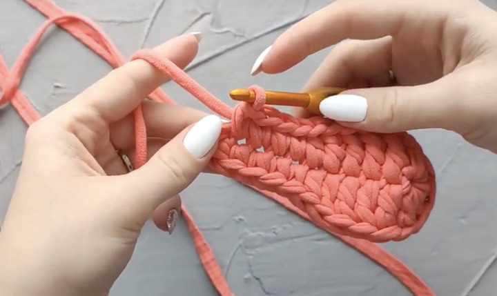 Довяжите ряд до конца полустолбиками с одним накидом. В двух прибавках и соединительном столбике провяжите два полустолбика с одним накидом. Закройте ряд.