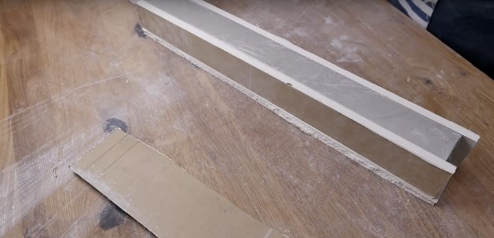 Нарежьте гипсокартон по алюминиевому профилю. Оберните профиль в пленку. С помощью клея ПВА соедините гипсокартонные детали вокруг профиля.