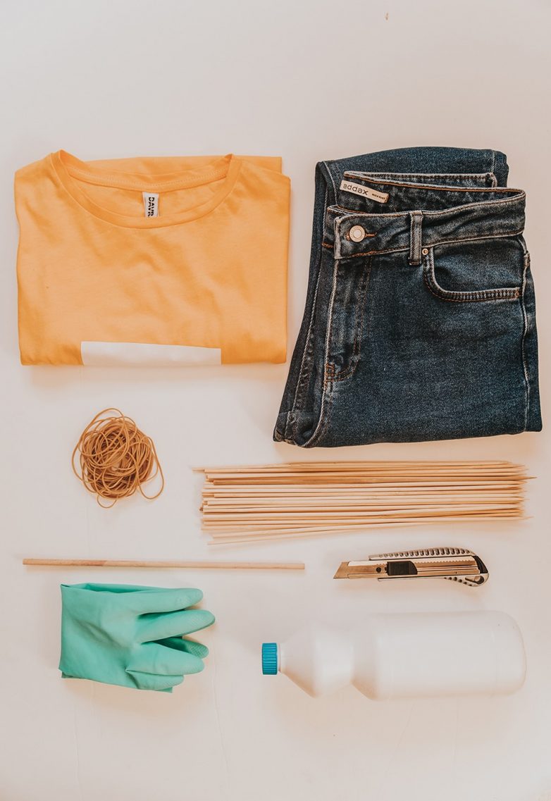 Само приятное, что для переделки джинсов не нужно покупать дорогие приспособления и тратить много времени. Все, что потребуется — банка отбеливателя, канцелярские резинки и деревянные шпажки.