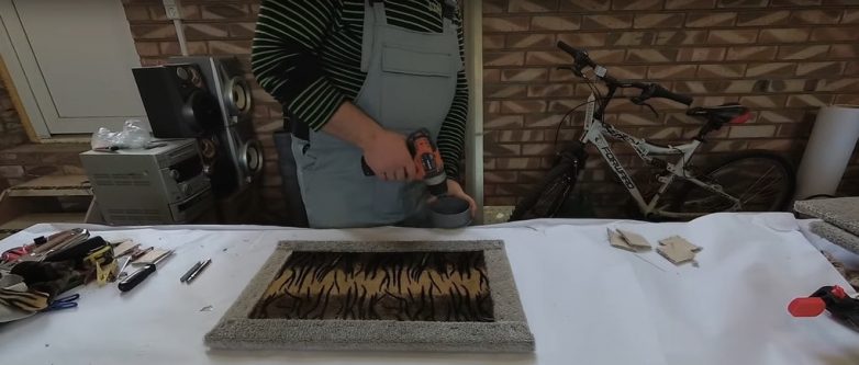 Площадки мы также обошьем ковролином, но сначала приклеим ткань к одной из сторон. Таким образом мы спрячем дерево и завершим композицию.