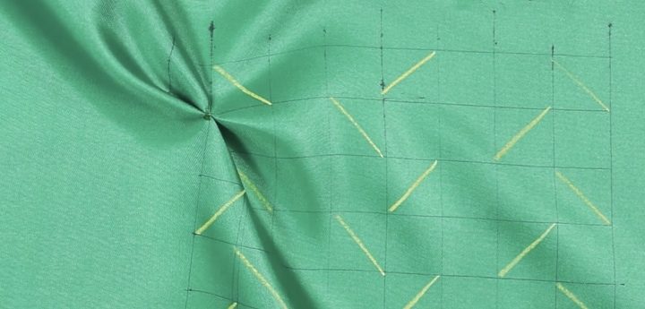 По намеченным внутри квадратов линиям сделайте шов, чтобы стянуть два угла. Повторите по всей разметке.