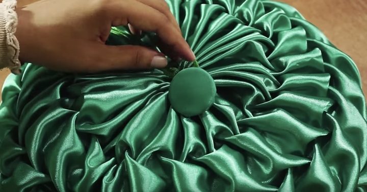 С помощью очень длинной иглы и нити, сложенной несколько раз, пришейте пуговицу, протянув нить через всю подушку до другой стороны. Закройте обратную сторону такой же пуговицей.