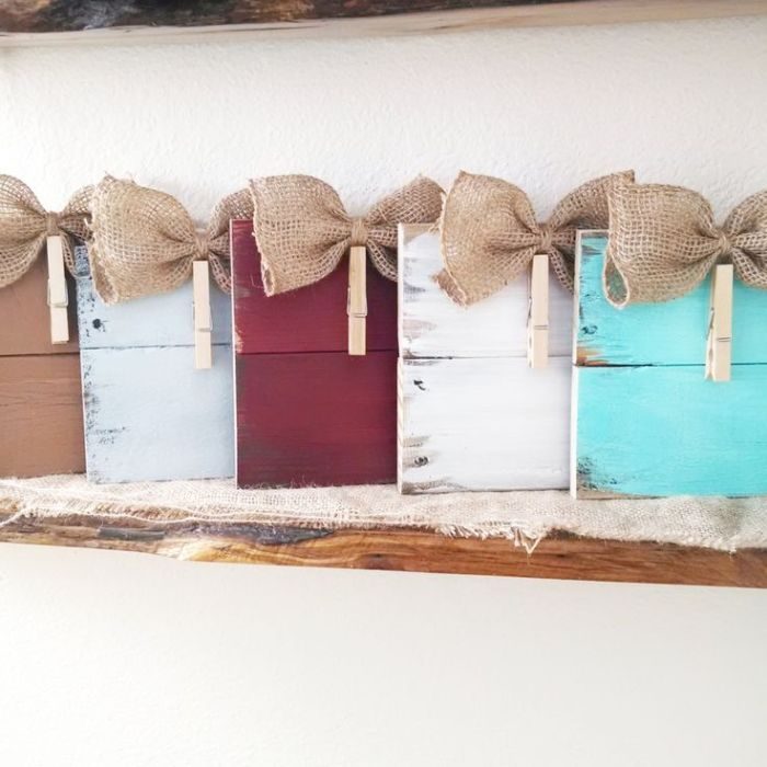 Интерьер становится особенно уютным, когда его украшают семейными фотографиями. Интересно, что рамки для них тоже можно сделать из ненужных старых досок. Стоит лишь закрепить несколько штук на стене. А фото прикрепить при помощи канцелярских булавок или клея. С небольших брусков получатся отличные настольные рамки, которые можно декорировать мешковиной и джутом.