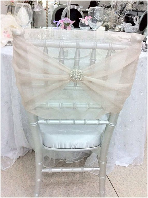 Украшение для спинки стула. Для этого из тюля выкраивается полотно вдвое больше ширины стула, плюс припуски на швы. Шьется чехол, который надевается поверх стула и украшается, как вам больше нравится. А можно просто тюль завязать на спинке красивым бантом.