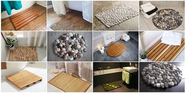 Еще один очень интересный вариант коврика для ванной сделан из плоских, гладких камешков. На подложку из любого материала разложите гальки примерно одинаковой формы, затем тщательно приклейте их и получите коврик, который будет напоминать каменистый пляж. Он может быть темным, окрашенным в любой цвет, или натурального цвета необработанных галек разного оттенка, а пошаговый мастер-класс Вы найдете здесь. Фантазируйте, ведь все подвластно лишь Вашей фантазии!