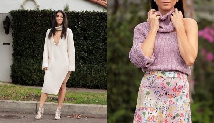 Используя эту технологию, можно преобразить не только свитера, но и вязаные платья! Добавив к образу нарядную обувь, переделанный свитер можно превратить в вечерний наряд.