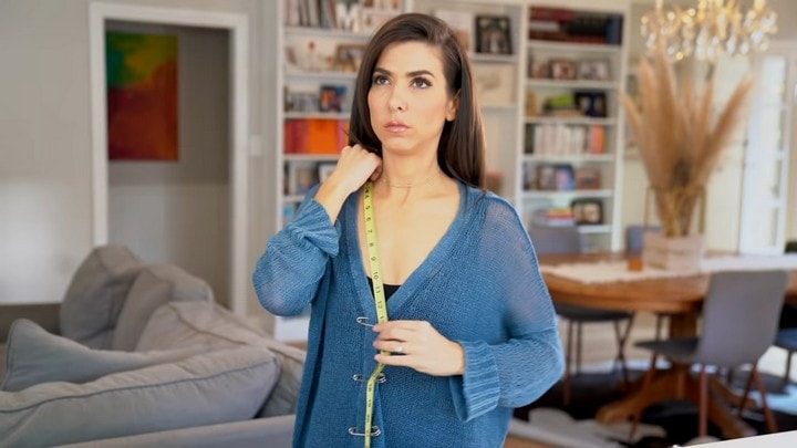 Для этого проекта лучше брать свитер, который вас обтягивает. Если же вещь шире желаемого, выверните её на изнанку и, проложив по боку шов, отрежьте лишнее.